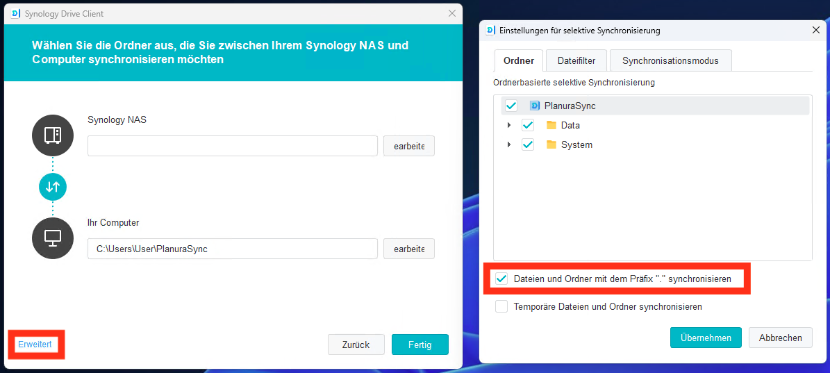 Mit Synology Drive werden die benötigten Daten lokal auf den Computer gespiegelt, damit Planura auch auf diese Dateien zugreifen kann.