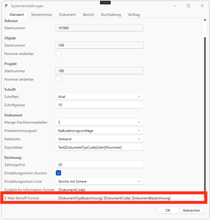 Im Feld „E-Mail-Betreff-Format“ kann beispielsweise folgender Betreff hinterlegt werden: